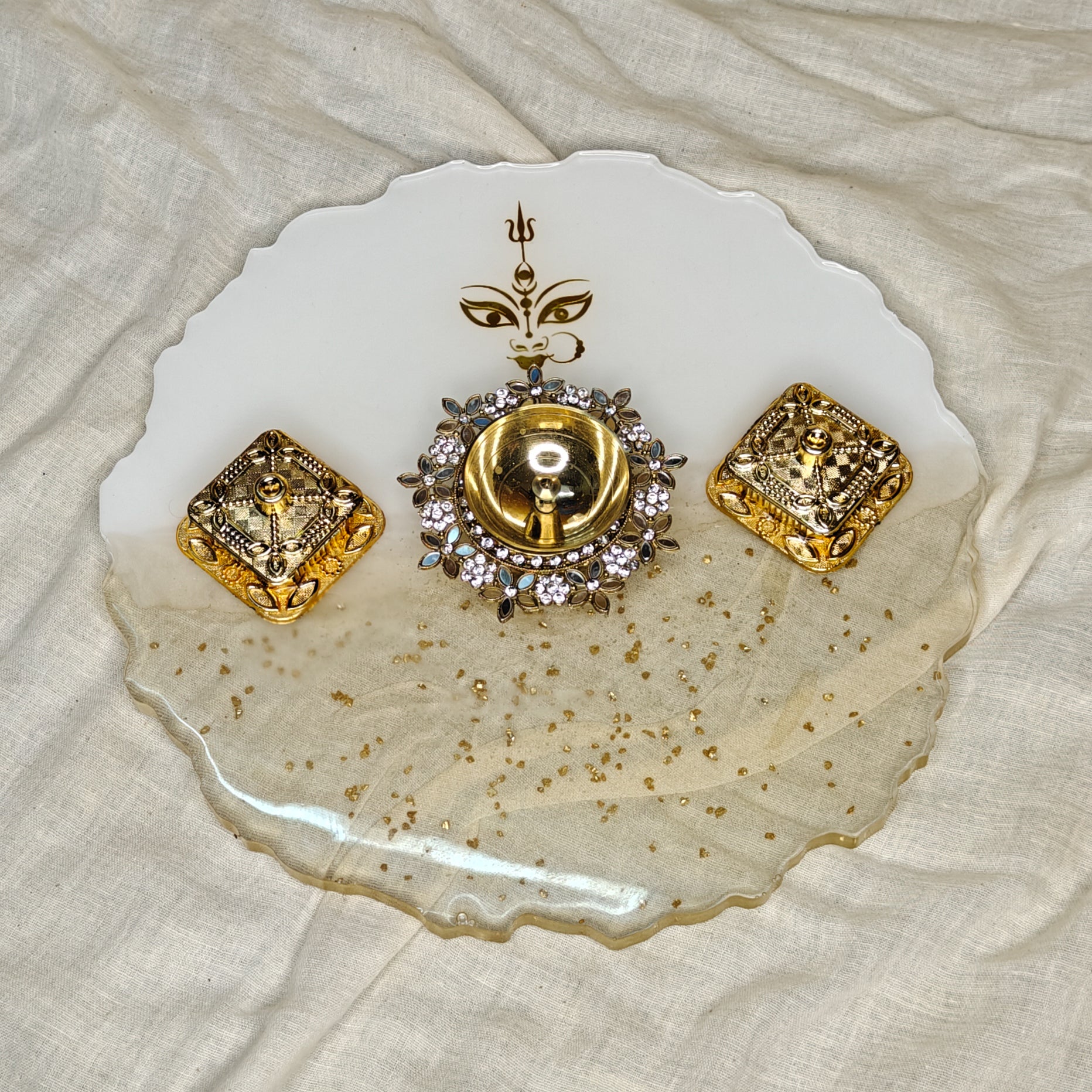Invoke divine blessings this Navratri with our stunning 10-Inch Handcrafted Resin Pooja Thali, specially designed to honor the strength and beauty of Maa Durga.
